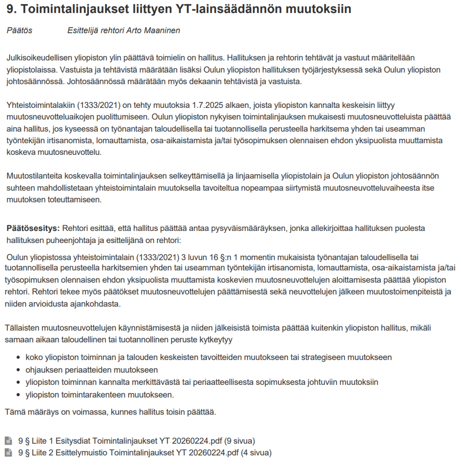 Lukiessani Oulun yliopiston hallituksen kokouksen 24.2.2026 esityslistaa hätkähdin sen kohdasta 9. Hetken luulin lukevani Pahkasika-lehden jälkipainosta.