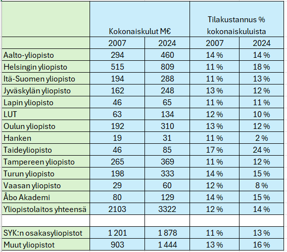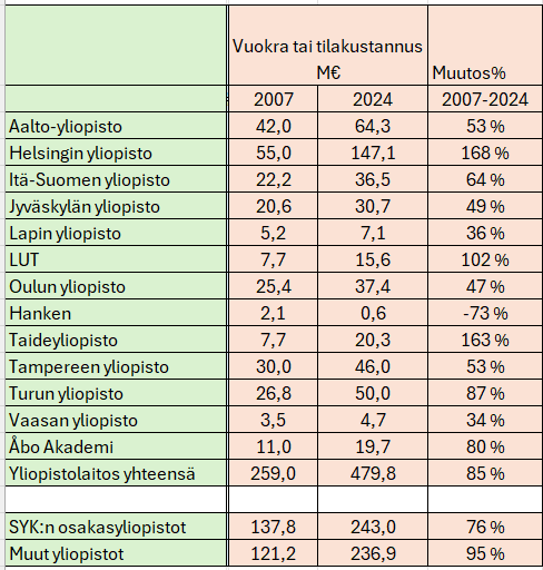 Vuokrat 2007 ja tilakustannukset 2024 eivät kaikkien yliopistojen kohdalla tarkoita täsmälleen samoja kuluja. Sopimukset ovat pääsääntöisesti sisältäneet sekä pääoma- ja ylläpitovuokran. Taulukossa silmiinpistävä poikkeus on Helsingin yliopisto, joka 2007 maksoi pääomavuokraa ja hoiti ylläpidon itse. Samoin on saattanut olla taideyliopiston osien kohdalla (Sibelius-akatemia, kuvataideakatemia ja teatterikorkeakoulu). Kuitenkaan niiden osalta vastaavaa mainintaa ei vuoden 2008 raportissa ole.