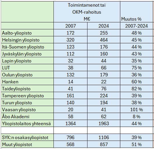 Vuonna 2007 yliopistoille myönnettiin rahoitus toimintamenoihin enimmäkseen tavoitteiden perusteella. Myöhemmin valtion tuki muuttui tutkinto- ja tutkimustulospohjaiseksi OKM-rahoitukseksi. Tuon jälkeen SYK:n ulkopuoliset yliopistot ovat onnistuneet rahoituskisassa paremmin.