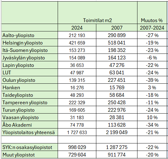 Yliopistojen toimitilat ovat vähentyneet merkittävästi. Ainut kasvattaja on Hanken. Kiinnostavasti SYK:n osakasyliopistojen ja muiden yliopistojen toimitilat ovat muuttuneet lähelle samassa suhteessa. Yliopistojen välillä on kuitenkin isoja eroja.