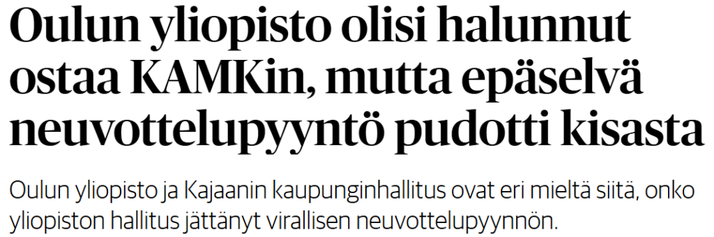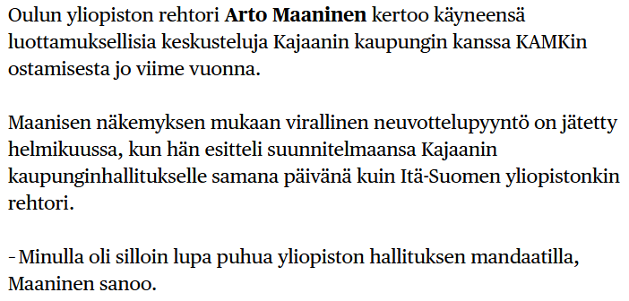 Kalevan artikkelissa Oulun yliopiston rehtorin lausumasta jää epäselväksi, onko Kajaania lähestytty ensimmäisen kerran helmikuussa 2025 vai 2026. Joka tapauksessa rehtorin mukaan virallinen neuvottelupyyntö on ollut olemassa ja hänellä on mielestään ollut yliopiston hallituksen mandaatti.