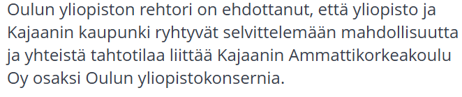 Kajaanin kaupunginhallituksen kokouksen 24.3.2026 pöytäkirjasta alle lainatun perusteella on kiistatonta, että kontaktissa on ollut Oulun yliopiston rehtori. Mutta kirjauksen perusteella ehdotus Oulun yliopiston hallitukselle on ehkä jäänyt rehtorilta tekemättä. Kaupunginhallitus näet on valtuuksia tarkistaessaan jäänyt kaipaamaan Oulun yliopiston hallituksen aloitetta ja rehtorin neuvottelumandaattia.