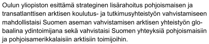 Tutkimusvararehtorin blogissa ei sanallakaan mainita transatlanttisuutta, Amerikkaa, eikä minkäänlaista ydintoimijuutta. Jos strateginen rahoitus on tuollaiseen tarkoitukseen myönnetty, niin se olisi sellaiseen myös käytettävä. Muutoin OKM:lta voinee odottaa arktista asennetta.
